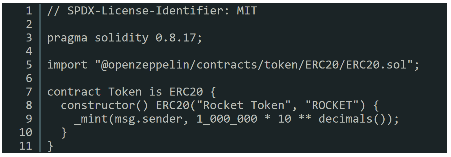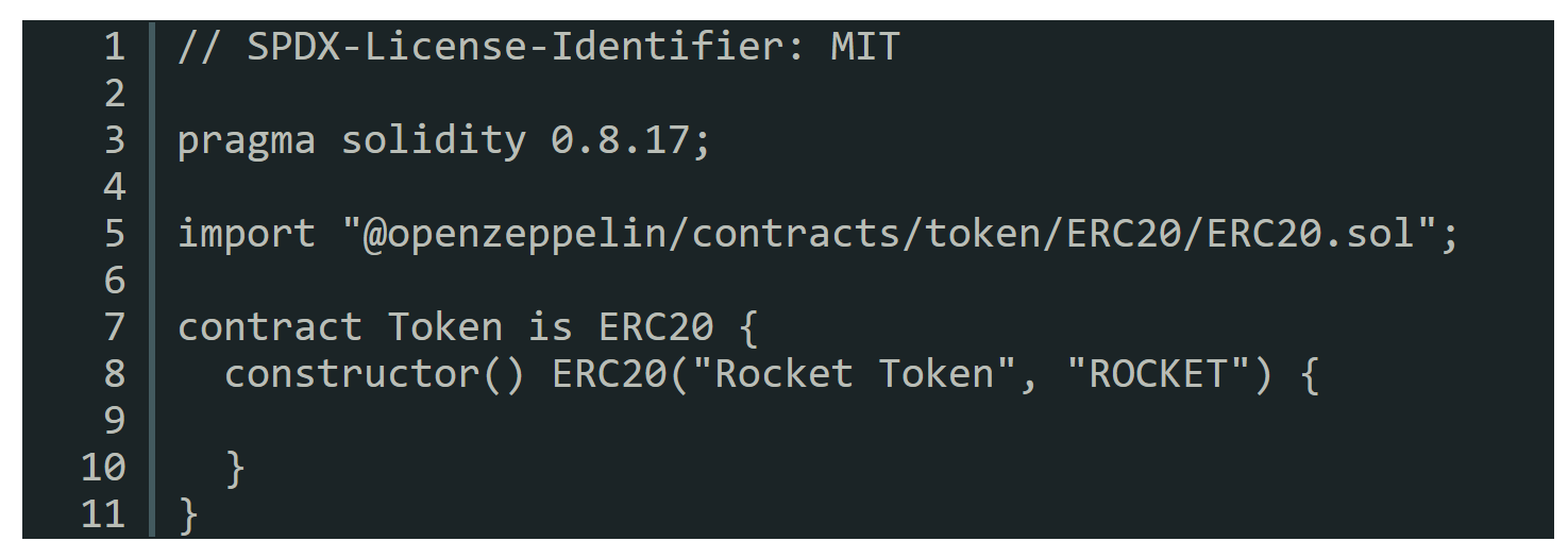 所有依赖项都已加载,现在我们可以在代码中使用它们。让我们的代币合约继承ERC20合约。为此,我们使用is关键字来告诉Solidity合约正在扩展另一个合约。代码应如下所示: