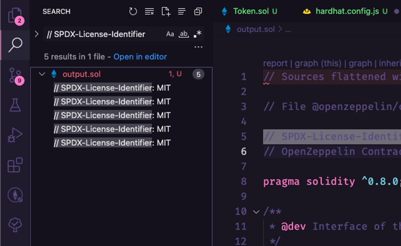接下来我们将验证合约的源代码。最简单的方法是将合约代码扁平化(将所有智能合约合并到一个文件中)并将其上传到Etherscan。让我们开始: