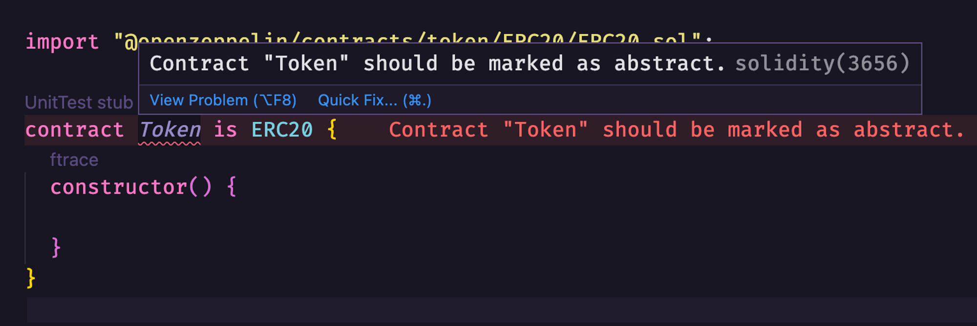 这是因为我们的合约需要实现某些功能并初始化ERC20继承代码。为此,我们将在构造函数中使用它。让我们添加代码来初始化继承的合约代码,如下所示: