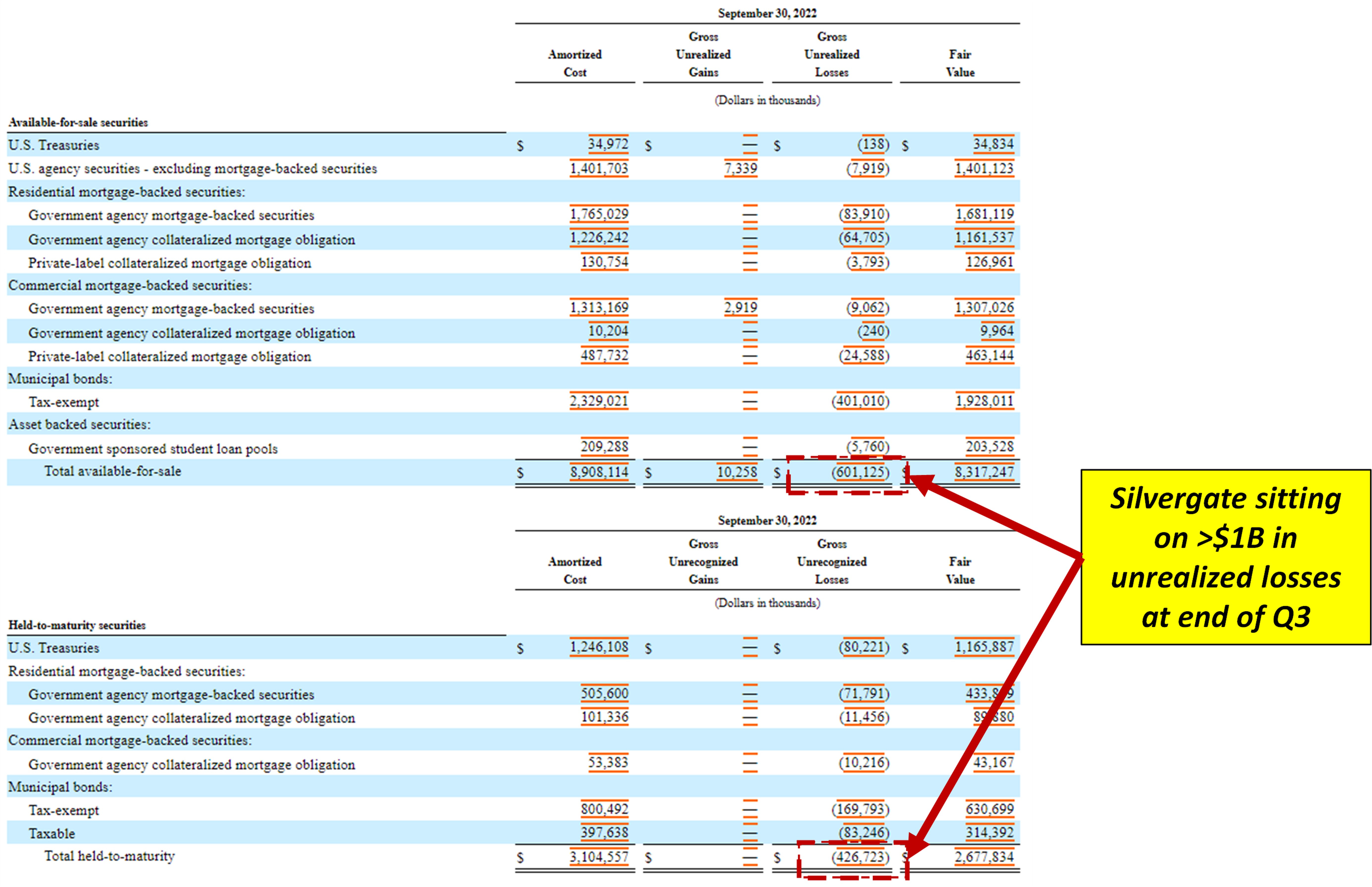 截至2022年第三季度末,Silvergate的证券账目上有超过10亿美元的未实现亏损。该银行显然是在历史上不利时期收购了长期资产。