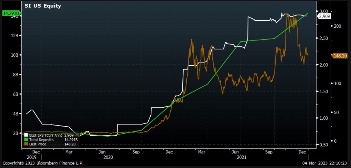 在加密货币上涨周期中,银门银行完全符合这一模式。加密货币储户将现金涌入加密货币生态系统,并愿意在Silvergate免费持有他们的法币,以换取对该银行专有的SEN网络的访问。廉价存款的大幅增长导致SI的盈利能力和股价在2020年和2021年飙升。