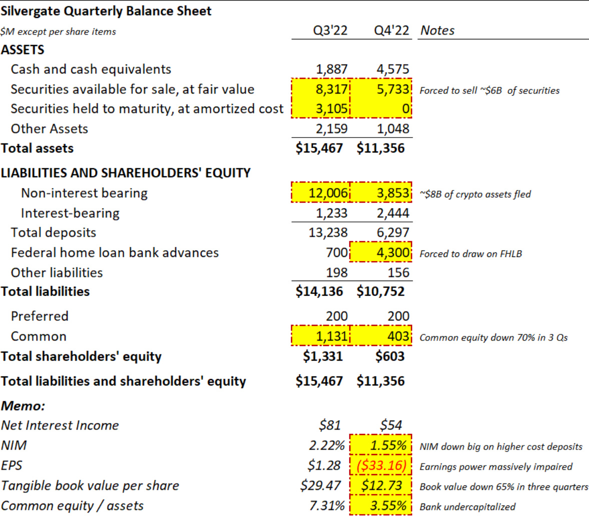 为了满足储户的赎回,Silvergate被迫出售60亿美元的证券,这些证券是它在过去1-2年中,以大约70亿美元的成本艰难获得的。结果,该公司实现了约9亿美元的证券损失,在此过程中,Silvergate的普通股损失达70%。