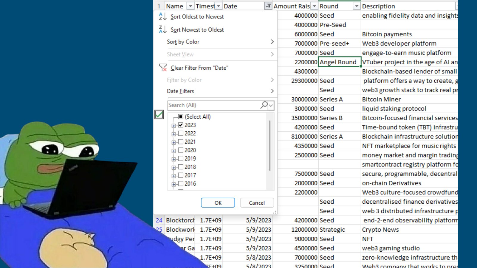 接下来,为每一列添加过滤器,按投资金额从大到小排序,然后选择适当的时间范围(例如2023年)。