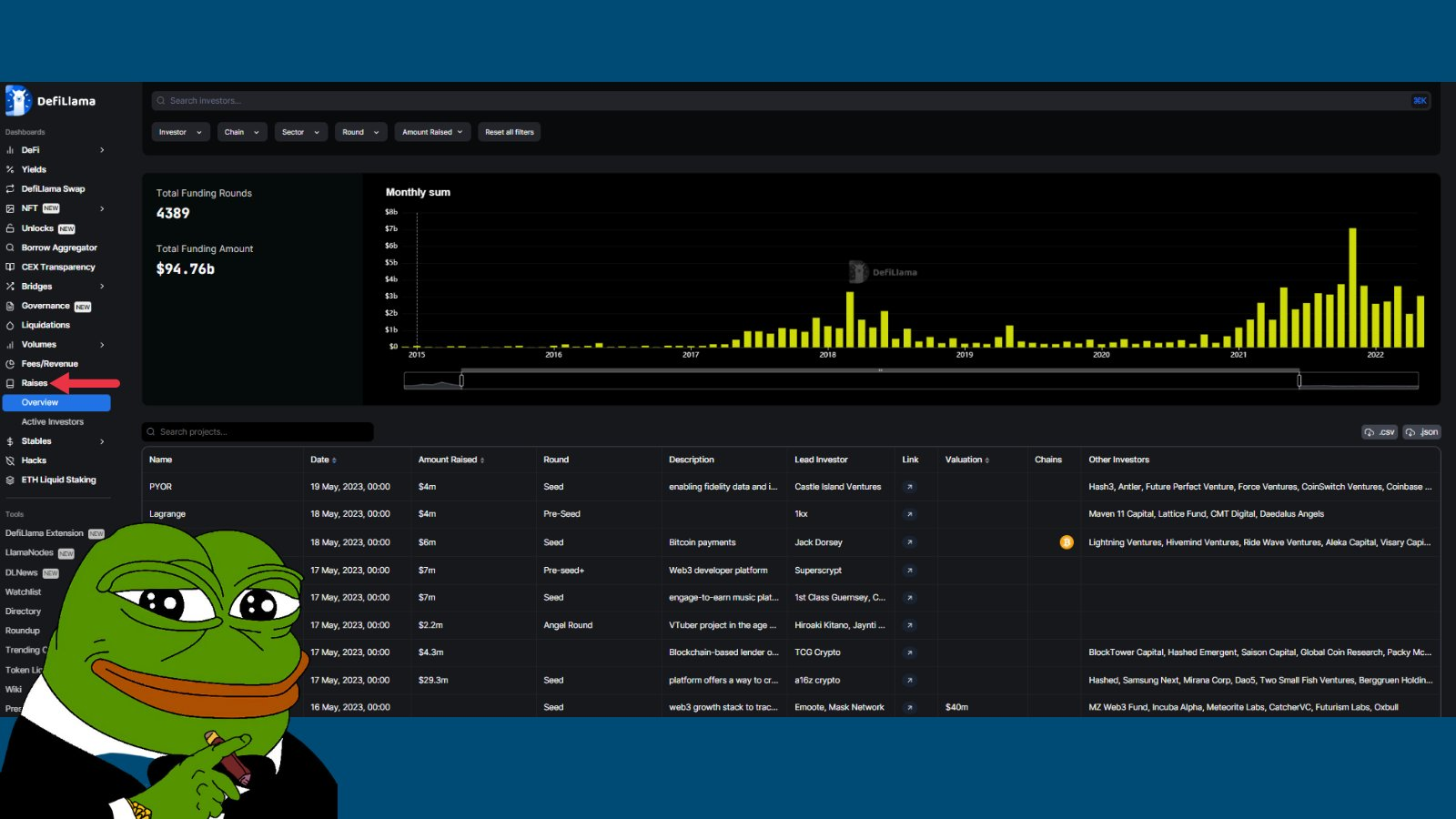 访问 @DefiLlama 网站,点击“Raises”选项。现在,你可以看到新项目、筹集资金的数量以及参与投资的风投公司。