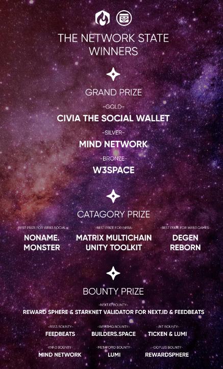 - 金奖:Civia the Social Wallet- 银奖:Mind Network- 铜奖:W3Space