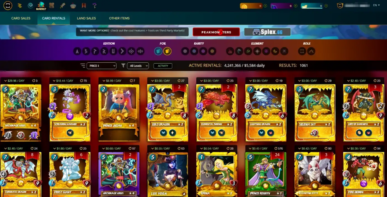 - 日常任务:游戏玩家需要玩不同的派系(水、火、土等),但不必拥有足够的卡牌来玩每个派系,而是可以选择租用卡牌来完成任务;