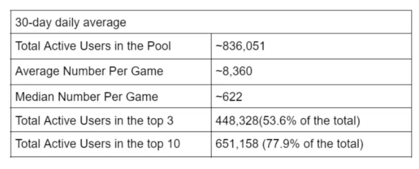 从上图数据可以清楚地看出,在用户方面,GameFi 项目赢家通吃,前三名游戏的用户占用户总数的一半以上,通过查看中位数和平均值之间的差异,我们可以看到大多数用户来自一小部分顶级游戏。