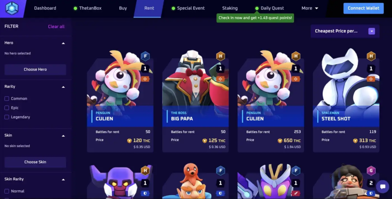 它是 BNB Chain 上最大的 MOBA(多人在线战斗竞技场)游戏之一,结合了免费游戏和游戏赚钱模式,有两种类型的代币——Thetan Coin(THC)和 The Gem(THG),玩家通过参与战斗或完成其他任务来赚取 THC 或 THG。