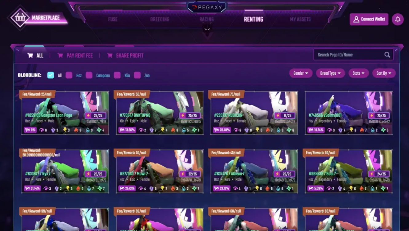 Pegaxy 游戏内有三种类型的租赁,分别是固定租赁、利润分成和直接租赁。