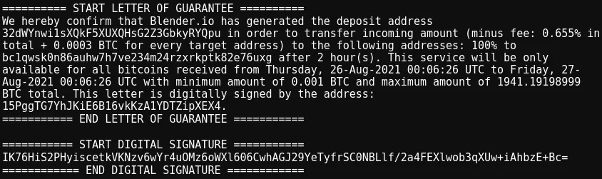 为了缓解这些顾虑,混币器将在每次启动混币时出具一份“保证书”。这些保证书由混币器的BTC“服务地址”签名,该地址的私钥由混币器的管理员控制。保证书充当一种托管链,显示了混币器存款地址所有权的加密证明和向用户提款地址的预期付款。