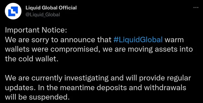 - 黑客从Liquid交易所窃取资产;