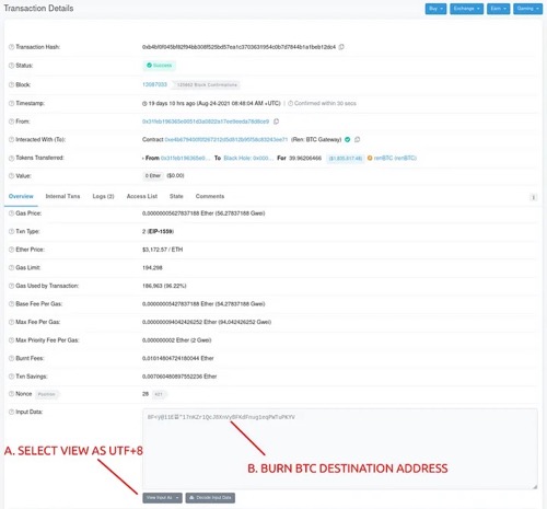 只能使用公共区块浏览器工具的用户可以轻松地跟踪从ETH到BTC的ren协议桥接上的流量。ren销毁的交易数据字段包括BTC目标地址的UTF-8编码版本。
