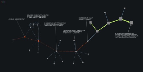- 使用图形遍历脚本分析Blender的活动,以确认被盗资金在大约存款时期的窗口期间是Blender活动的主要部分。