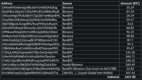 下面的表1包括了大多数兴趣地址的账户记录。 这些地址要么是由Liquid Global在他们的博客文章中报告的,要么是通过与黑客ETH地址相关的renBTC到Wasabi coinjoin流程发现的。