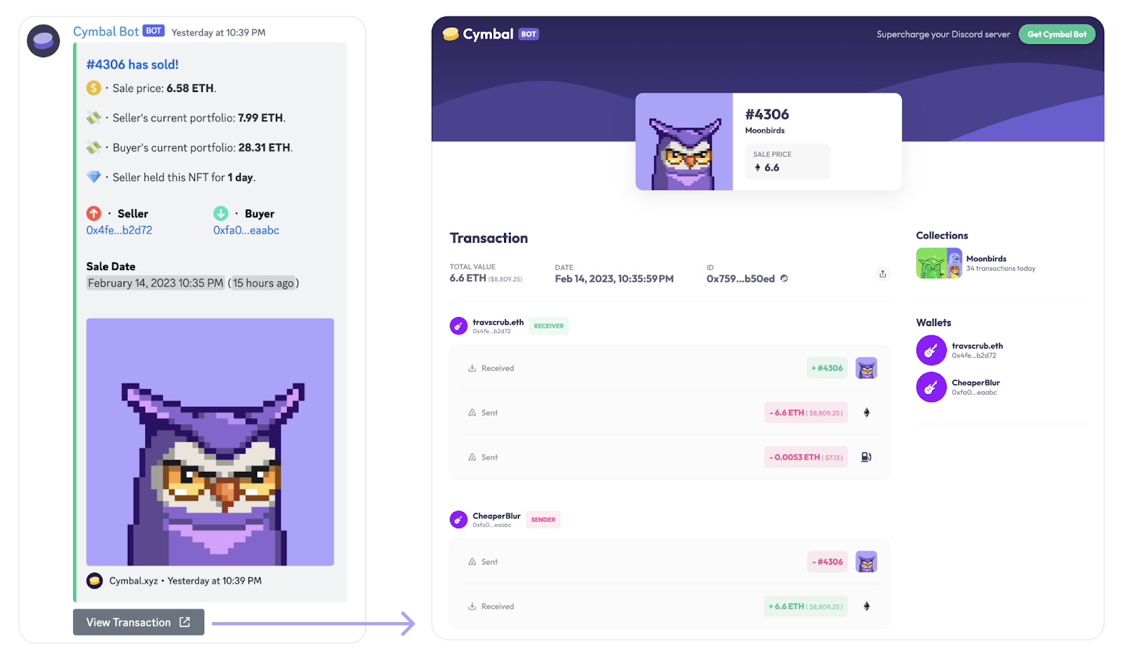 - 实时的NFT销售警报。获取发送到你的Discord服务器的实时警报,了解Cymbal当前正在跟踪的数千个ETH和SOL NFT集合的销售情况。警报可以根据销售价格、卖家利润和其他可配置参数进行定制。
