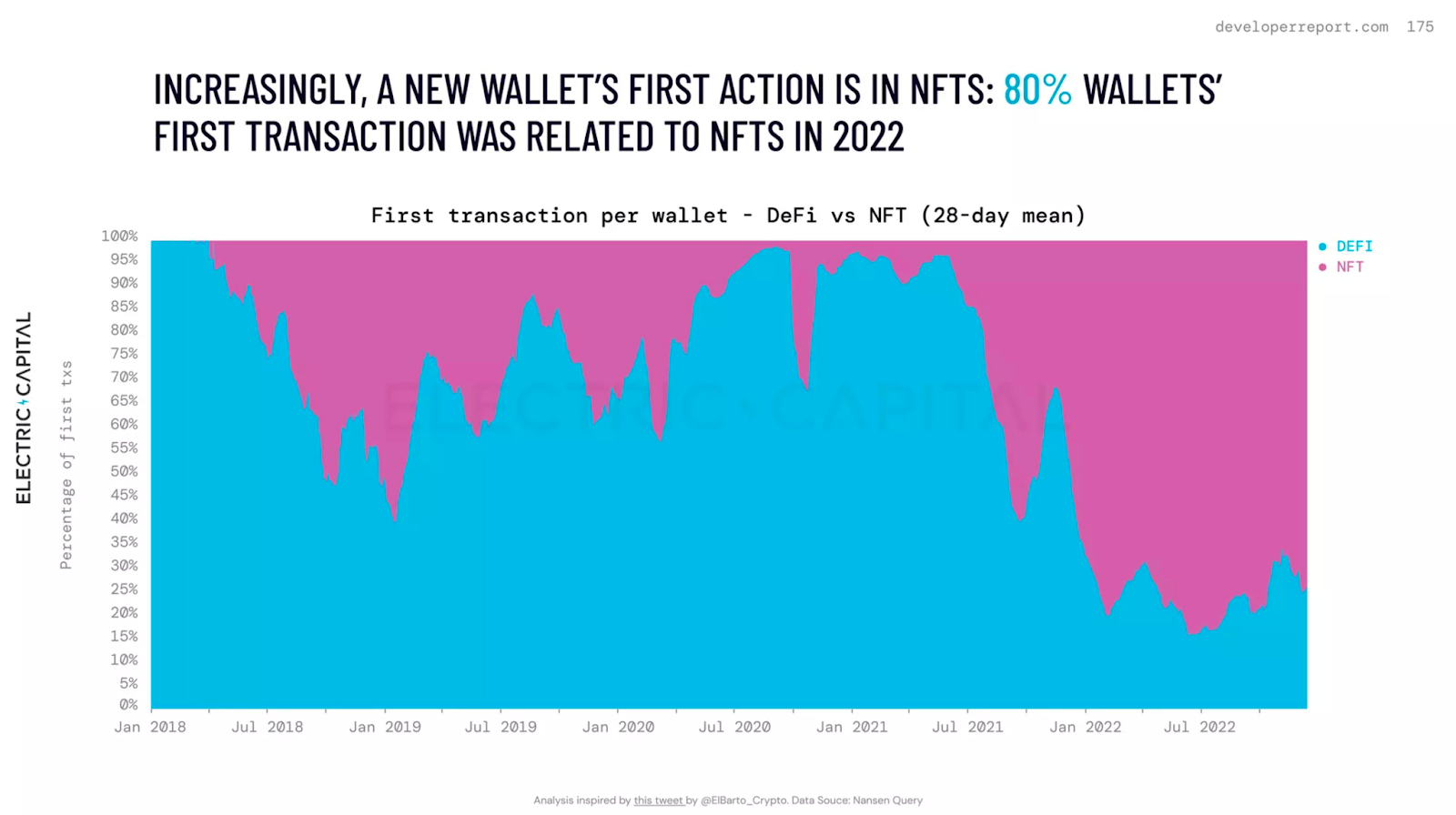 在Cymbal,我们的目标是使区块链更易于理解和利用,从NFT开始,我们认为这是区块链对消费者最友好的使用案例。根据Electric Capital关于加密货币活动的2022年开发者报告,在80%的情况下,一个新的加密货币钱包所采取的第一个行动与NFT有关。对于大多数的加密货币新用户来说,NFT已经成为通往Web3的门户。