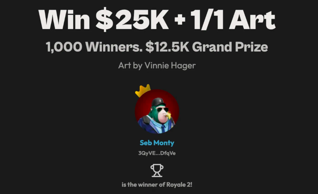 Royale 2是Cymbal与著名艺术家Vinnie Hager和Magic Eden合作在Solana举办的第二场链上活动,该活动刚刚结束。在过去的10天里,参与者参加了由NFT支持的在线抽奖活动,有机会从25,000美元的奖池中赢得奖金以及来自Vinnie的原创艺术作品。随着《Royale 2》的结束,最终统计结果如下:
