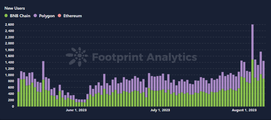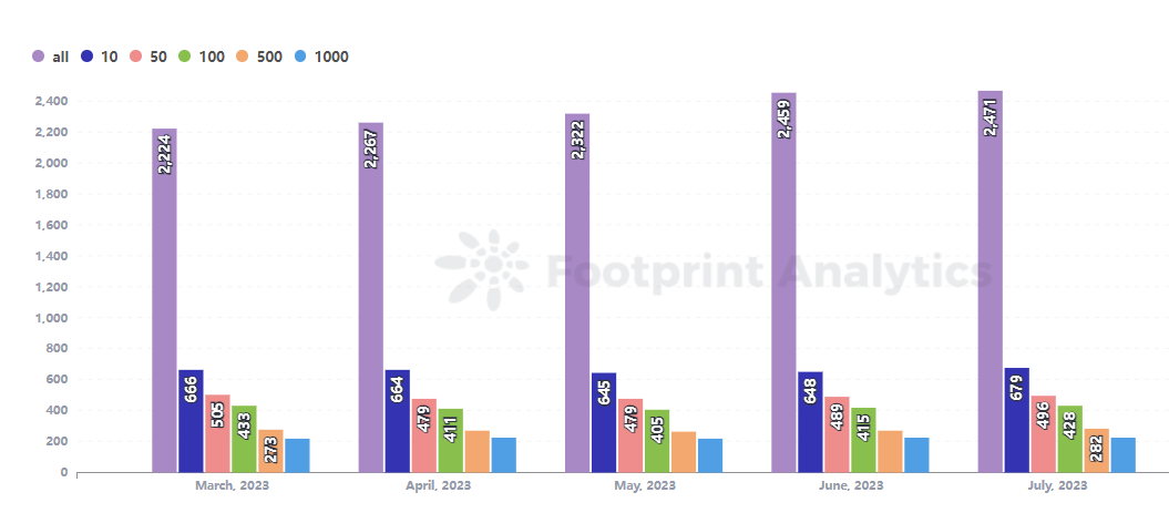 2023 年 7 月,Web3 游戏领域出现了小幅增长,但对于许多项目来说,用户采用仍然是一个持续的挑战。根据 Footprint Analytics 的数据,活跃的区块链游戏数量略有增加,达到 2,471 个。然而,只有其中的 9%(226个)月活用户超过 1,000 名。