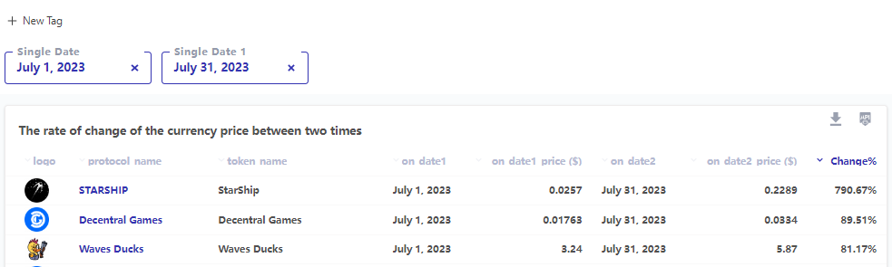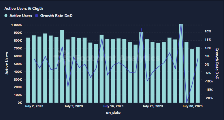 7 月份,用户互动的高峰出现在 7 月 28 日,当天有 1,014,190 名用户参与了各种协议和游戏。当天,Alien Worlds 以 202,533 名用户脱颖而出,占据了整个市场近 20% 的份额,凸显了头部游戏在拉动活跃用户总数方面的重要作用。然而,7 月 30 日用户参与度略有下降,活跃用户数量降至 692,940 人。