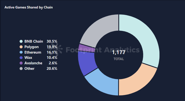 本月共有 1,177 款活跃游戏保持了用户参与度。特别值得注意的是,在活跃用户方面,BNB链占比达到 30.5%。