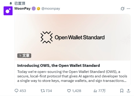 3 月 23 日,加密支付公司 MoonPay 宣布开源 Open Wallet Standard(OWS),这是一项面向 AI Agent 的多链钱包标准。该标准以 MIT 开源协议发布于 GitHub、npm 和 PyPI,核心主张是为 AI 提供一个安全、通用的钱包接口。使得 Agent 可以持有资产、签名交易、完成支付,而私钥 / 助记词永远不进入 Agent 的运行上下文。