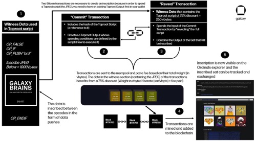 Inscription是任意数据和相关元数据的blob,后者告诉比特币节点如何呈现所述数据(是图像、文本还是其他?) Inscription在功能上类似于以太坊的calldata,因为它们存储只读数据。由于Tapscript(在比特币的Taproot升级中引入)和Segregated Witness(2017年比特币升级)的怪癖,这些Inscription理论上可以大到4MB(事实上,有人在2023年2月初mint了一个3.96MB的Inscription)。Inscription数据作为见证数据的一部分被发布到比特币的区块链上——这是交易中存储交易签名的部分,可由任何运行ORD软件的完整存档比特币节点解码为可查看内容。
