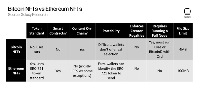 与以太坊NFT相比,比特币NFT具有不同的技术堆栈。这两种数字收藏品的主要区别如下: