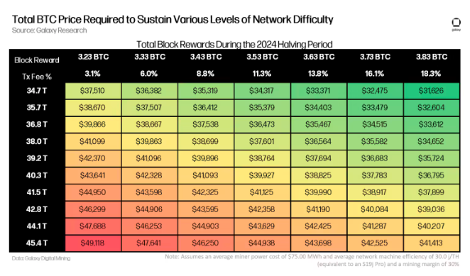 当你沿着图表的y轴向下移动时,可以观察到不同级别的网络难度,当你沿着x轴移动时,可以观察到区块奖励的总水平以及交易费用占总奖励的百分比。例如,在网络难度为40.3 T,区块总奖励为3.53 比特币(交易费用占总奖励的12.8%)的情况下,比特币的价格需要39,927美元才能维持该网络安全水平,而矿工也可以赚取30%的毛利率,假设他们的平均电力成本为75美元/ MWh,并以30 j/TH的速度运行S19j Pro。