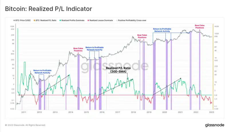 指标:已实现利润比(P/L)的 30D-SMA 恢复到 1.0 以上,这表明,持有未实现亏损的投资者正变得疲软,新一波需求能够吸收所获得的利润。