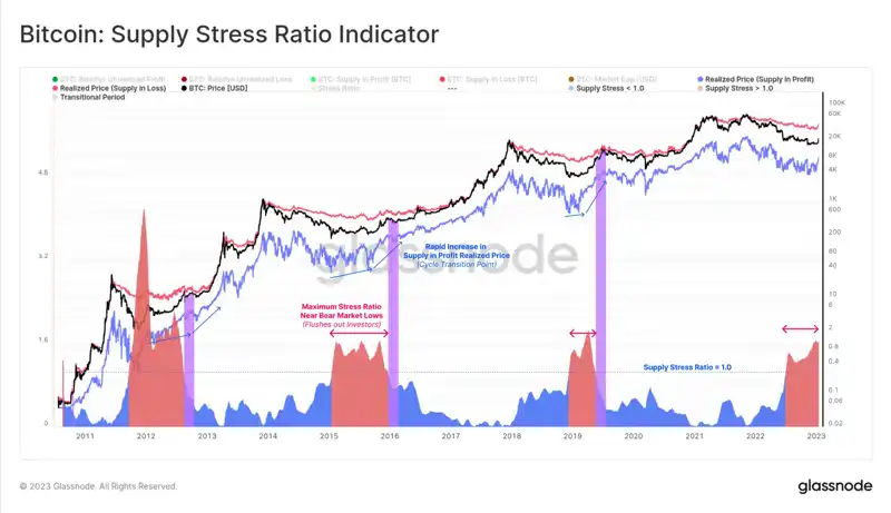 在达到周期最高价(ATH)后,市场进入需求恶化阶段,以未实现损失持有的净财富增加。我们可以通过供应压力比率来衡量整个市场的经济压力。