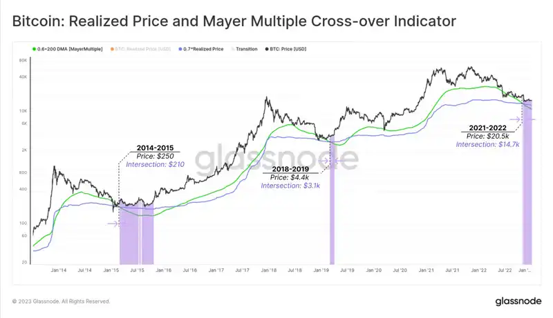 指标:从历史数据上看,实现价格* 0.7 和 200 D-SMA * 0.6 定价模型之间的交集发生在深熊阶段。这是由于投资者堆积导致链上交易量加权实现价格稳定的结果, 200-DMA(200 天的平均差指标)而未加权 200-DMA(200 天的平均差指标)由于宏观价格下降趋势而继续下降。