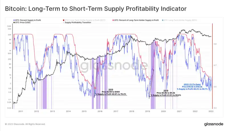 指标:由于熊市低点时大量的供应再分配,与长期持有者相比,新买家持有的供应百分比往往对价格非常敏感。因此,当供应占利润的比例超过长期持有者时,通常意味着近几个月发生了大规模的供应再分配。