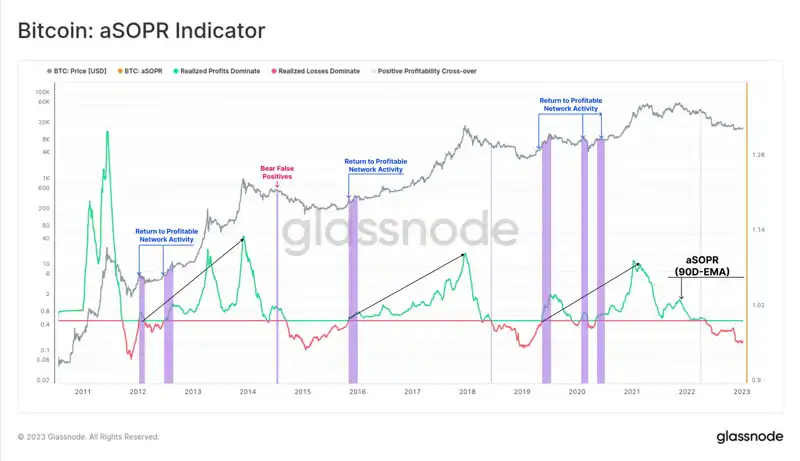 指标:aSOPR 的 90D-SMA 恢复到 1.0 以上,这表明宏观趋势转变回到了盈利的链上支出。这表明很大一部分链上市场活动是盈利的。