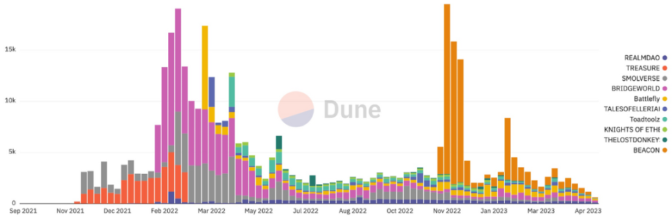 这些趋势在 GameFi 领域也同样明显,就像 Axie Infinity 和 STEPN 尝试过的方式,首先通过针对各个游戏定制的代币激励来推动渐进式网络效应。相比之下,TreasureDAO 则利用平台内个别游戏的小型网络来促进平台范围内的代币($MAGIC)生态系统的扩展。
