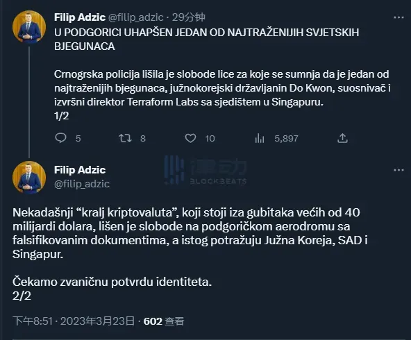 3 月 23 日,黑山内政部长 Filip Adzic 在其社交平台宣布,Terraform Labs 联创 Do Kwon 在黑山波德戈里察机场因伪造证件被警方拘留,韩国官员随后也证实了 Do Kwon 确实在黑山被捕。据知情人士透露,Do Kwon 的个人护照曾在塞尔维亚被扣留。