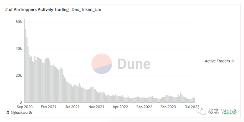虽然空投能拉销带新,但也有一些证据表明,它对用户的忠诚度并没有实际帮助。根据 Dune 用户@jhackworth 建立的 Uniswap 数据看板,只有 6.2% 空投地址仍持有 UNI,而当初收到 UNI 空投且至今每周都保持活跃的地址,只占 Uniswap 周活地址的不到 2%,交易量占比只有 1%。