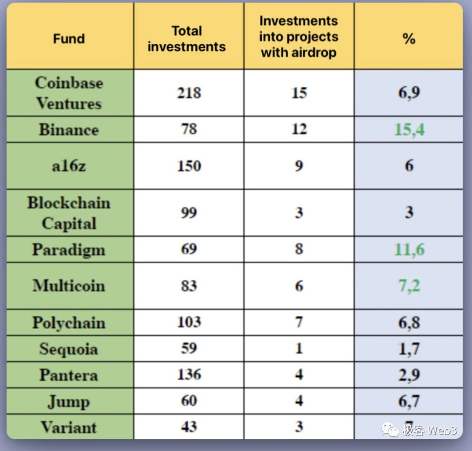 根据空投博主@ardizor 数据总结,在知名投资机构中,Binance、Paradigm 和 Multicoin 投资的项目空投概率最高,分别为 15.4%,11.6% 和 7.2%。
