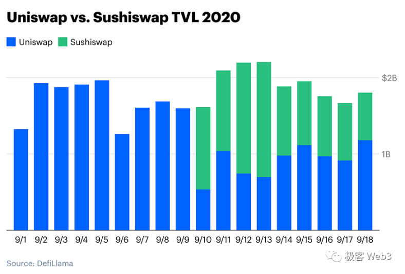 项目方空投内卷史的故事可以从 Uniswap 开始说起。在流动性为王的 DeFi 赛道中,以 Sushi 为首的 DeFi 项目在 2020 年的 DeFi Summer 中,通过流动性挖矿激励从 Uniswap「吸血」抢占了不少的用户份额和锁仓资金(最多达到 12 亿美元)。在这种前提下,Uniswap 迫于压力,史无前例般的为用户发放大量 UNI 空投,启动流动性挖矿计划,吸引用户回流抢回 DEX 龙头位置,并维持老大的位置至今。