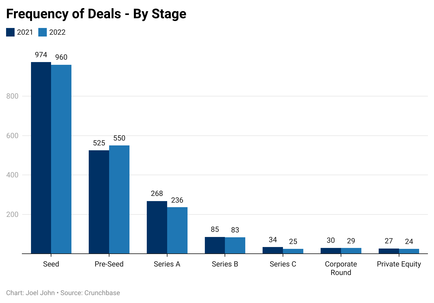 对于当今市场上的创始人来说,这一切意味着什么?值得注意的是,与公众舆论相反,现在加密货币领域发生的资本与交易比2020年更多。下图按阶段划分了过去两年的交易频率: