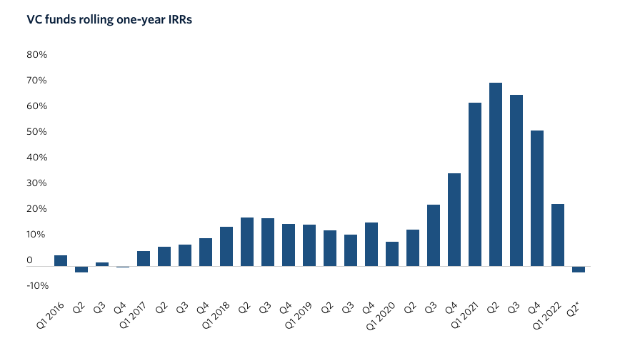 在深入探讨Web3通过资不抵债的交易所和功能失调的稳定币所面临的挑战之前,让我们首先阐明风险投资本身的状况。我们正处于这样一个奇怪的阶段,风险投资市场的内部收益率在六年来首次出现负值。这个指标是各基金的平均值,因此可以肯定地说,从那些投资人的角度来看,风险投资作为一种资产类别正处于混乱的境地。这些机构通常是养老基金或基金的基金。