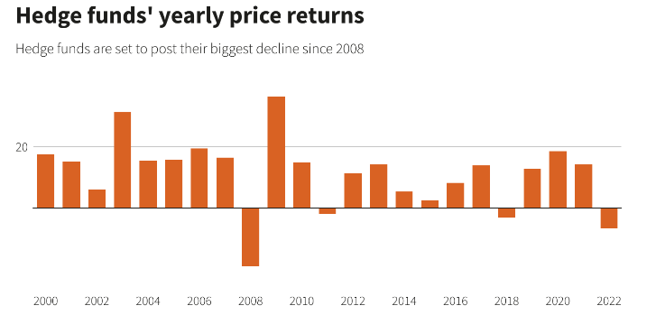 仅仅在孤立的风险回报海洋中看待数字资产是没有意义的。一些基金积极地交易这些流动性工具。我很好奇对冲基金的状况如何,它们的表现似乎也不太好。据估计,对冲基金即将度过自2008年以来最糟糕的一年。而与加密货币相关的对冲基金的资产管理规模平均下降了55%。