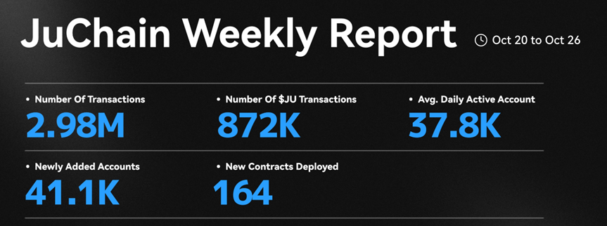 与此相对应,链上数据也给出了清晰回声。10 月 20–26 日,JuChain 共录得 298 万笔交易、3.78 万日均活跃账户、4.11 万新增账户及 164 个新合约部署;$JU 当周交易量达 87.2 万笔。这些数据印证了 Ju.com 从内容输出到上币策略、从用户增长到链上活跃的正向循环正在形成。