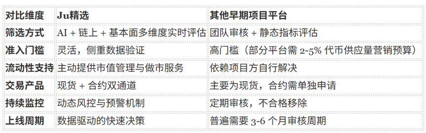 Ju.com 选择了第三条路:精选模式。它的核心理念是,在"速度"与"质量"之间找到稳健平衡:既能快速捕捉早期潜力资产,又能通过系统筛选控制风险。