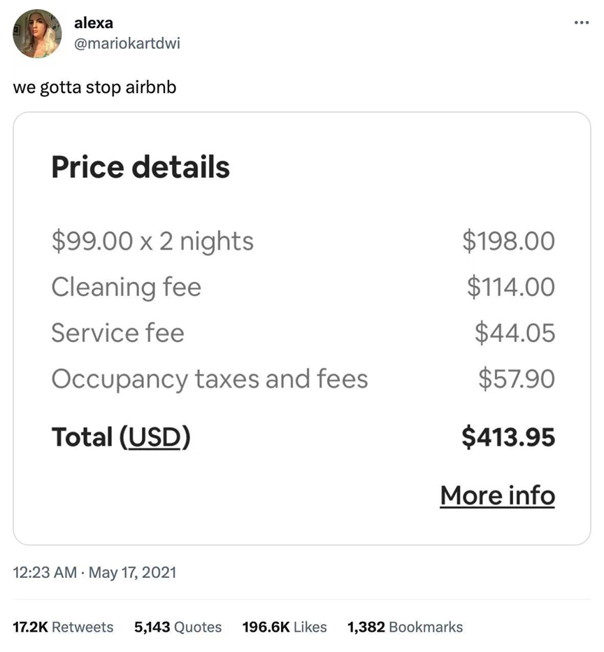 Uber的目标是颠覆出租车业务,而Airbnb则类似地瞄准了酒店。而Uber已经开始在涨价上掩盖一些价格的增加,而Airbnb一直在通过其费用推销价格。互联网注意到了这一点。