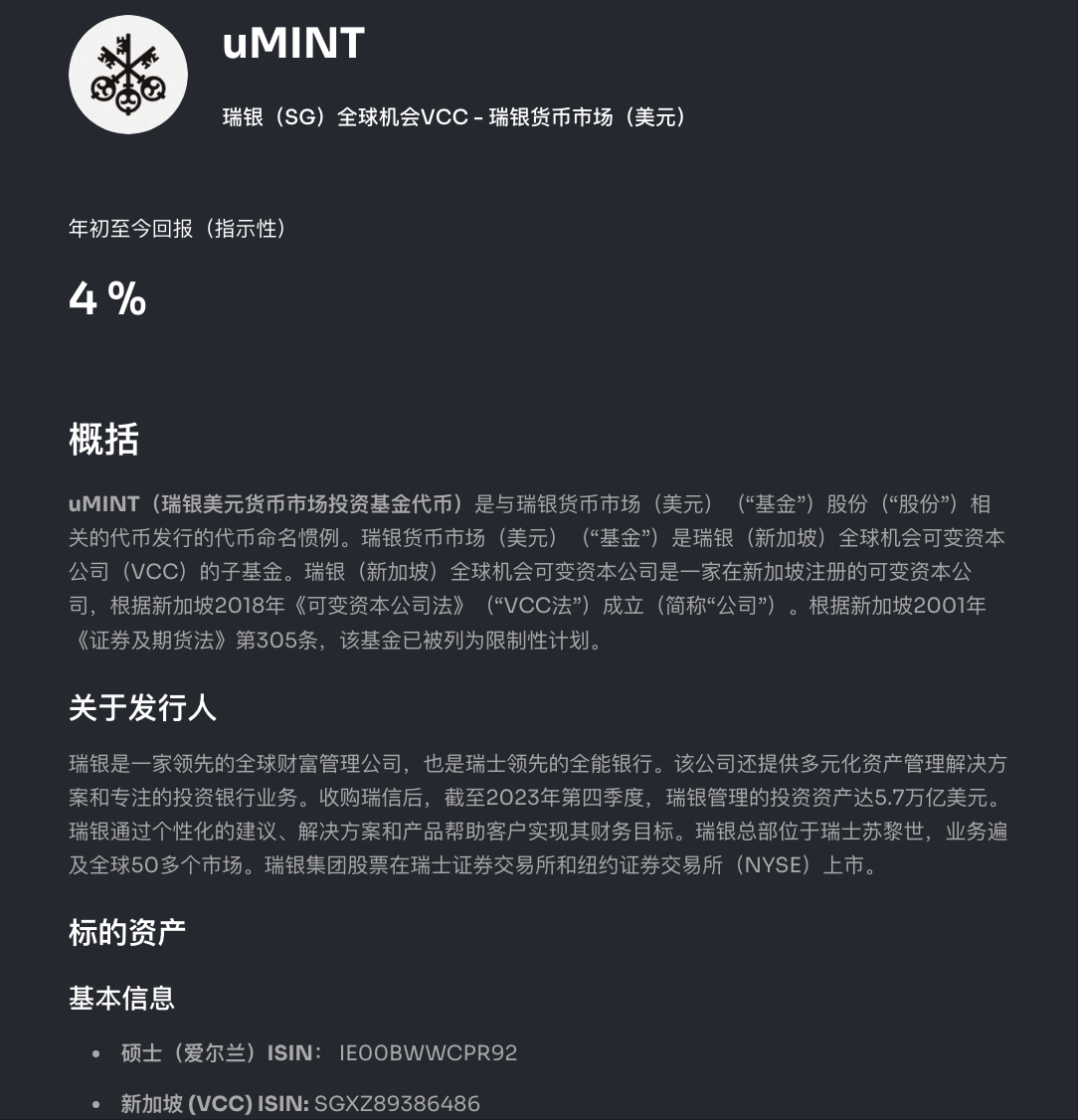 uMINT 即瑞银美元货币市场投资基金RWA代币