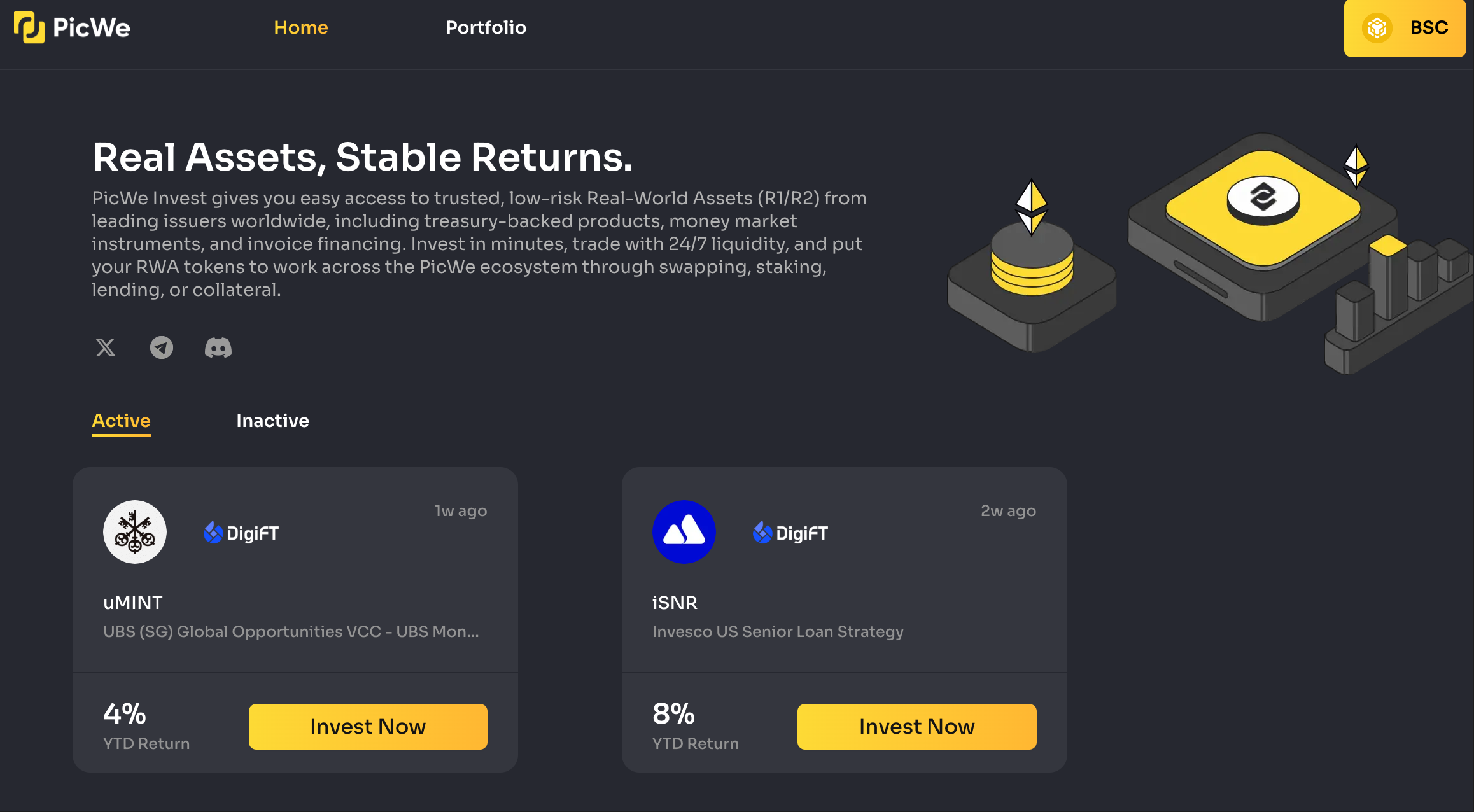 PicWe Invest 是面向全球用户的RWA低风险资产(R1/R2类型资产)分销平台。 PicWE用区块链技术重塑美债投资,带来前所未有的便利和收益: