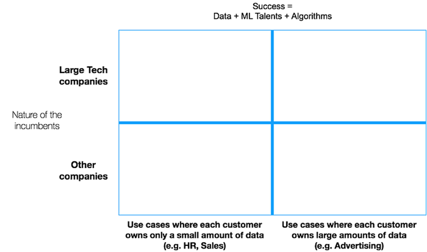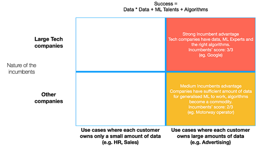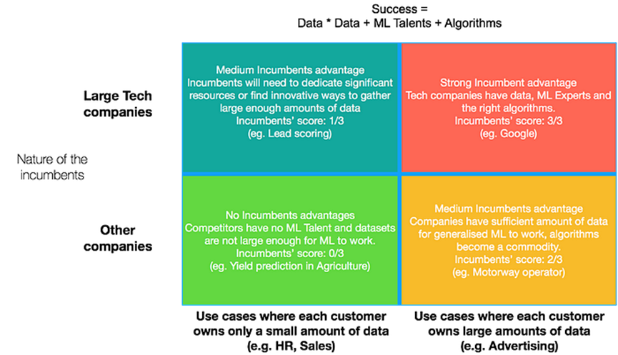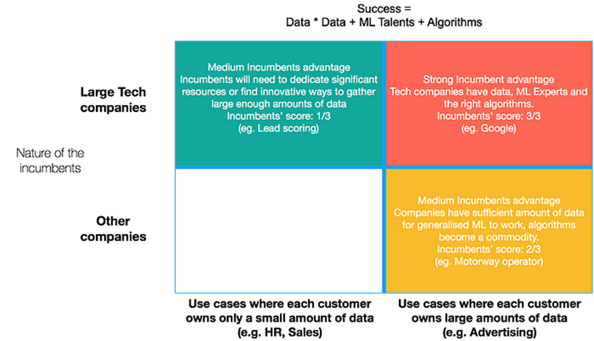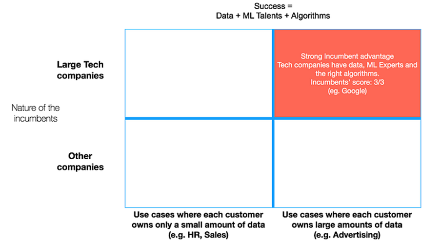 如果我们考虑那些由大型科技公司解决的案例,这些案例中每个潜在客户都拥有大量数据,那么现有企业的优势就非常强大。除了典型的现有企业优势(例如,接触客户的机会、更大的投资和承受亏损的能力),大型科技公司拥有多年积累的大量数据。