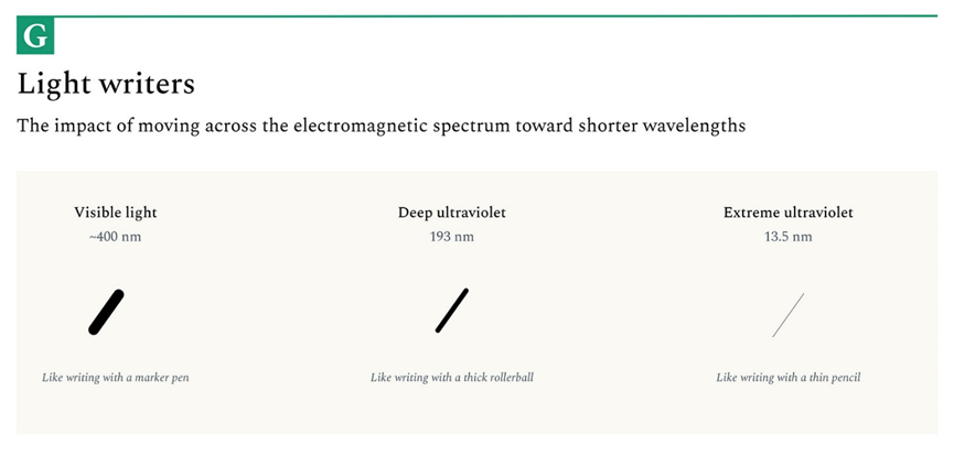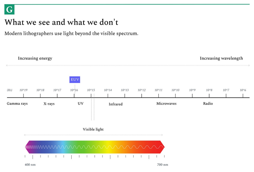 ASML与其他光刻供应商的不同之处在于它使用光的类型以及如何控制光。在历史上,光刻使用可见光谱来形成芯片。在1980年代的大部分时间里,400至700纳米的波长足以雕刻具有“门”的晶体管,这些门的大小超过1000纳米。然而,随着产业努力将更多的晶体管塞入一个芯片中,增加其功率,光刻师遇到了一个基本的限制:可见光太粗糙了。