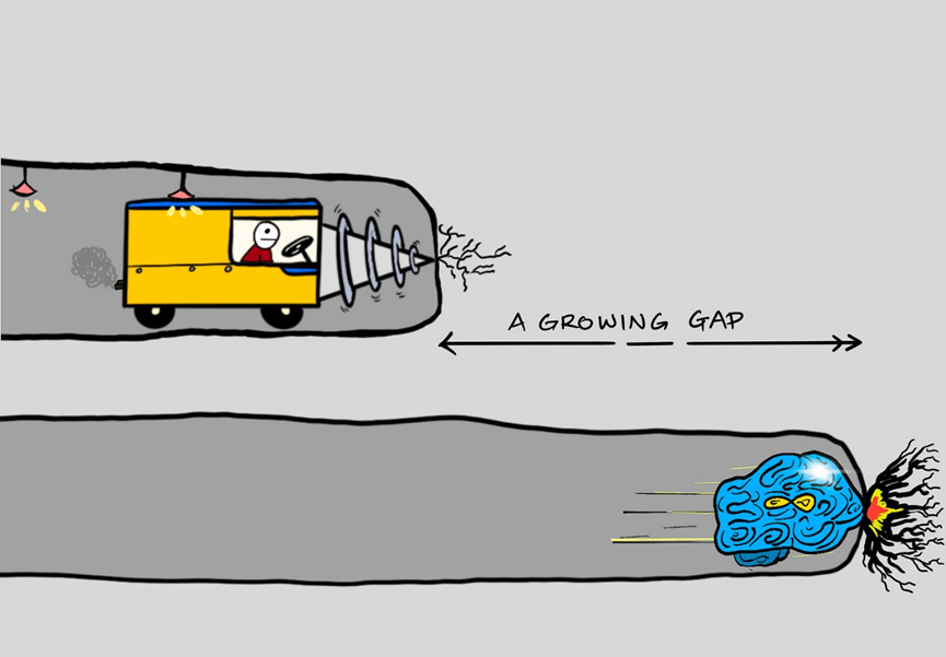 我们与众不同。受到对知识和进步的渴望的感染,人类与知识之山有着不同的关系。一代又一代,我们挖掘得更深,学到更多。我们也以不同的方式挖掘:起初我们使用手,然后是木棍,再然后是工具,现在我们坐在轰鸣的椅子上,指挥着一个巨大而旋转的钻头。