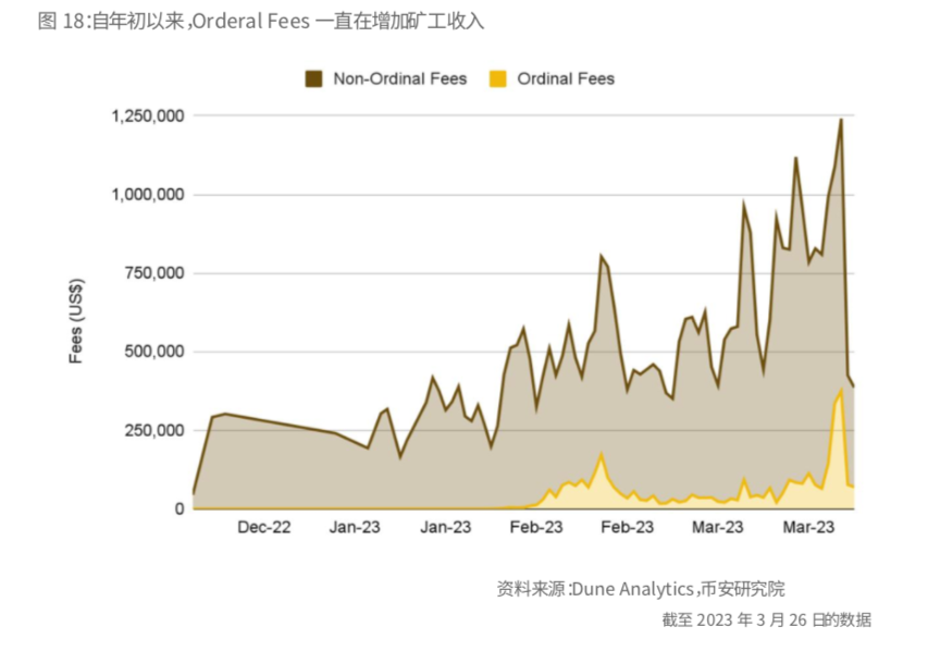 事实上,目前为 Ordinals Inscriptions 铸币支付的累计费用已超过 150 BTC(4) 。假设Ordinals 继续获得采用,这可能会产生对比特币区块空间的可持续需求,并确保比特币矿工减少对纯粹区块奖励的依赖(考虑到这种额外的收入流)。